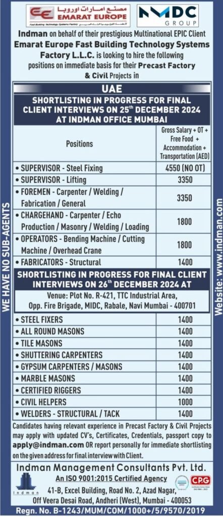 Job Opportunities in UAE: Apply Now for Precast Factory and Civil Projects Read More » December 13, 2024